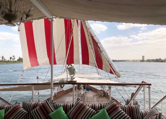 The Malouka Dahabiya distinguishes itself through its exquisite attention to design and decor. It feels less like a standard cruise and more like a friend’s beautifully appointed private yacht, where every corner reveals a tasteful detail, creating an atmosphere of understated luxury and creative inspiration. Key Features: Artistically Designed Cabins: Each cabin is individually decorated with an eye for design, blending antique furniture, local textiles, and modern amenities to create a cozy yet elegant sanctuary. Al Fresco Dining with Style: Enjoy gourmet meals prepared with care and presented beautifully on the deck. Dine under woven shades or the stars, where the setting is as memorable as the cuisine. Personalized, Attentive Service: A small, dedicated crew provides discreet and thoughtful service, anticipating your needs while giving you space to relax and enjoy the journey. Tranquil, Inspiring Spaces: The deck is outfitted with comfortable loungers, plush cushions, and shaded areas—perfect for painting, writing, reading, or simply daydreaming as Egypt glides by. Your sailing route prioritizes peace, beauty, and access to less-visited sites. Your knowledgeable guide provides context with a personal touch. Your journey may include visits to: Dendera Temple (the breathtakingly colorful and well-preserved Temple of Hathor) Gebel el-Silsila (the dramatic sandstone quarries with unique riverside carvings) Private Nile Islands & Sandbanks (for swimming, sketching, or a quiet picnic in paradise) Authentic Village Encounters (visiting local artisans or sharing tea in a Nubian home) Secluded Ptolemaic Temples (exploring archaeological beauty in serene solitude) The pace is leisurely, allowing you to fully absorb the beauty of each moment and location. Choose the Malouka Dahabiya if you want: A boutique, design-focused experience with an artistic and romantic ambiance. Intimate, sophisticated travel with a high level of personalized attention. To explore beautiful, secluded sites at a relaxed and contemplative pace. A journey that feels like a private retreat or creative escape on the water. Embark on a voyage where beauty is found in every detail, from the decor to the landscape. Why This Experience is Different: Artistic Design & Intimate Sophistication